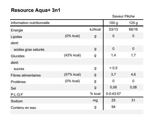 Resource® Aqua+ 3n1 saveur pêche: Eau, gomme guar partiellement hydrolysée (PHGG), gélifiant (E407), affermissants (E508, E333), épaississants (E415, E412), arômes, édulcorant (E950), correcteur d’acidité (E525), colorants (E160a, E120).