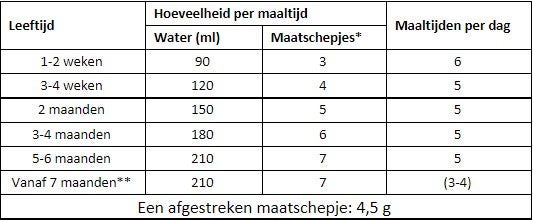 | Leeftijd | Water (ml) | Maatschepjes* | Maaltijden per dag |